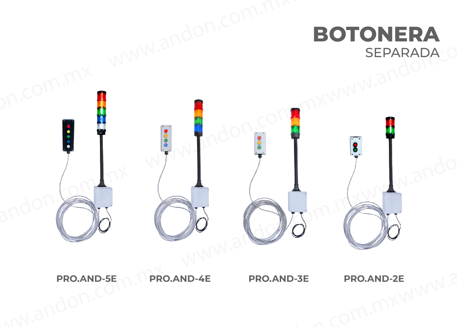 - PRO.AND-5E. Andon extensión Alámbrica IP67 con 5 torretas de 70 mm de 24 VCD