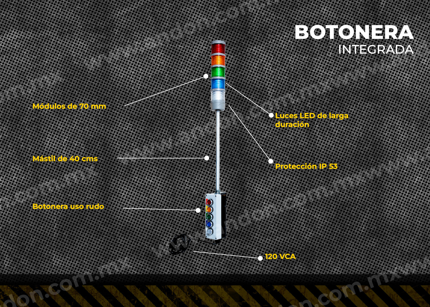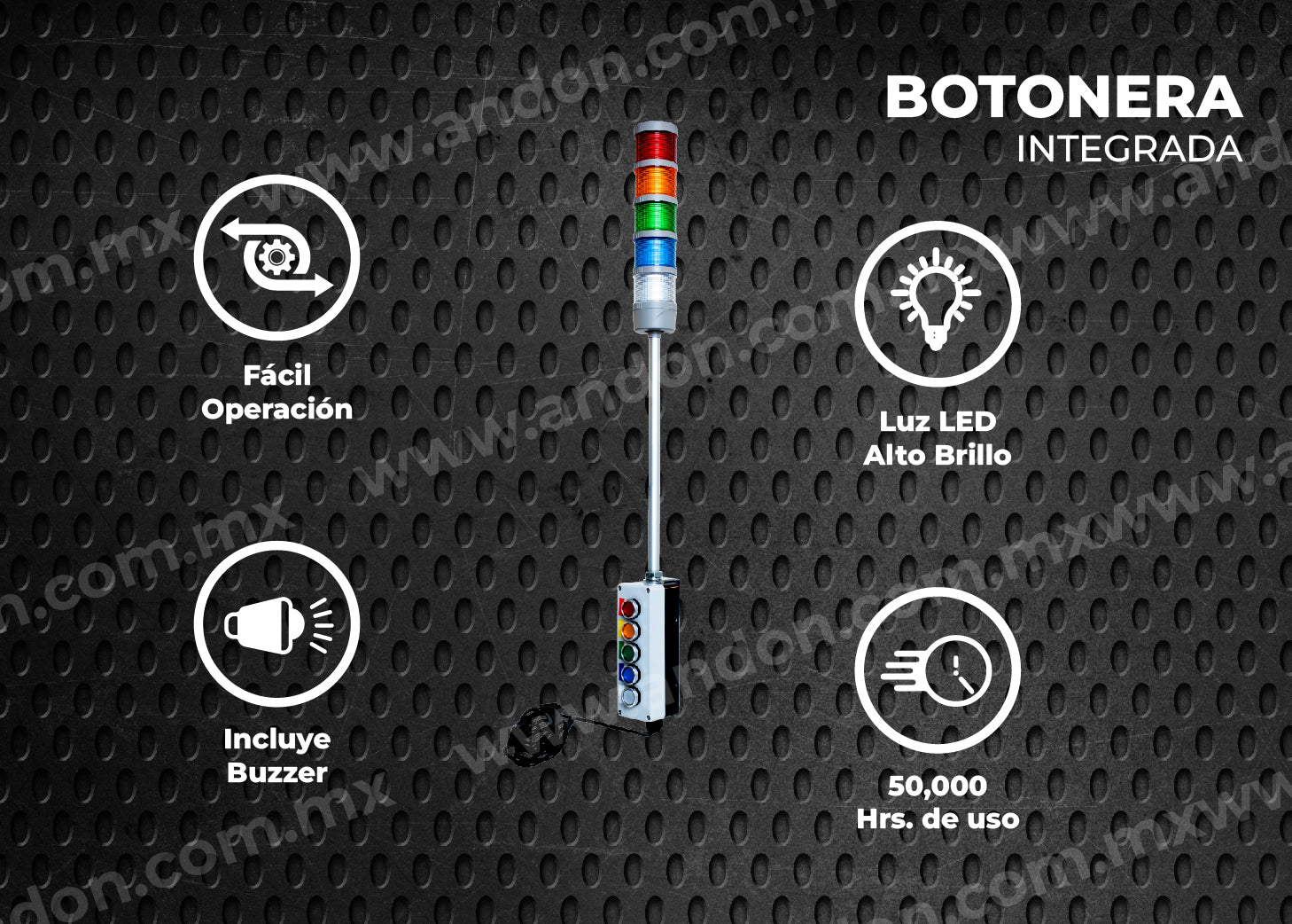 Este resistente equipo Andon tiene una botonera de uso industrial integrada. Se utiliza típicamente para que el operador pida ayuda de Materiales, Mantenimiento, Calidad, Operaciones, etc...